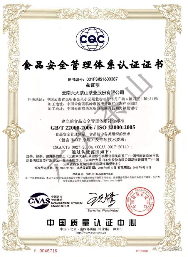 歷年來,六大茶山公司獲得國家有機(jī)食品認(rèn)證,通過SC認(rèn)證、食品出口衛(wèi)生注冊登記,云南省10大名品、云南省老字號、有機(jī)產(chǎn)品認(rèn)證企業(yè)、出口食品生產(chǎn)企業(yè)、中國茶葉行業(yè)百強(qiáng)企業(yè)、云南首批年份普洱茶質(zhì)量保薦溯源企業(yè)、云南首款曬青茶質(zhì)量保薦溯源企業(yè)、HACCP體系認(rèn)證企業(yè),通過ISO9001質(zhì)量管理體系認(rèn)證,ISO22000食品安全管理體系認(rèn)證。